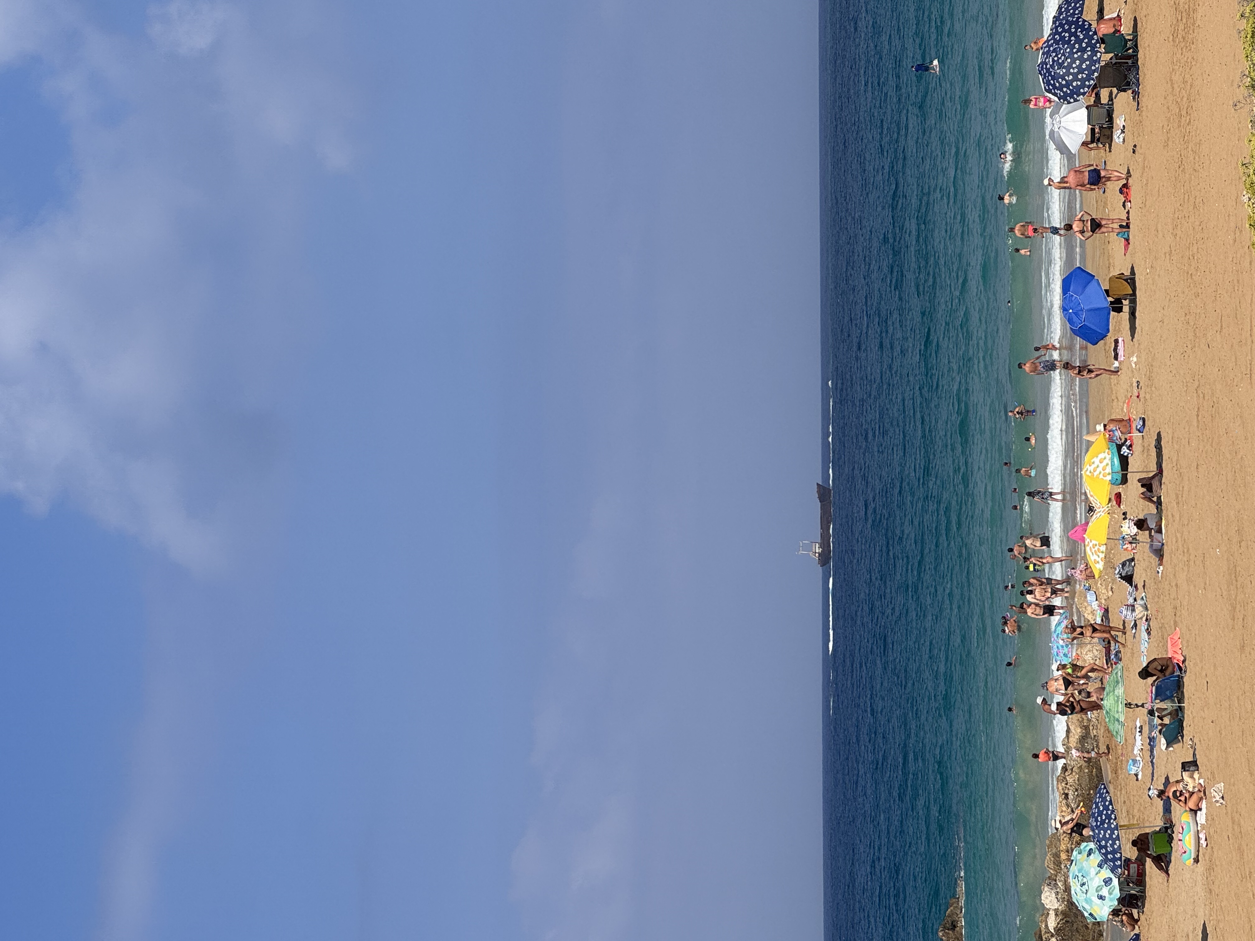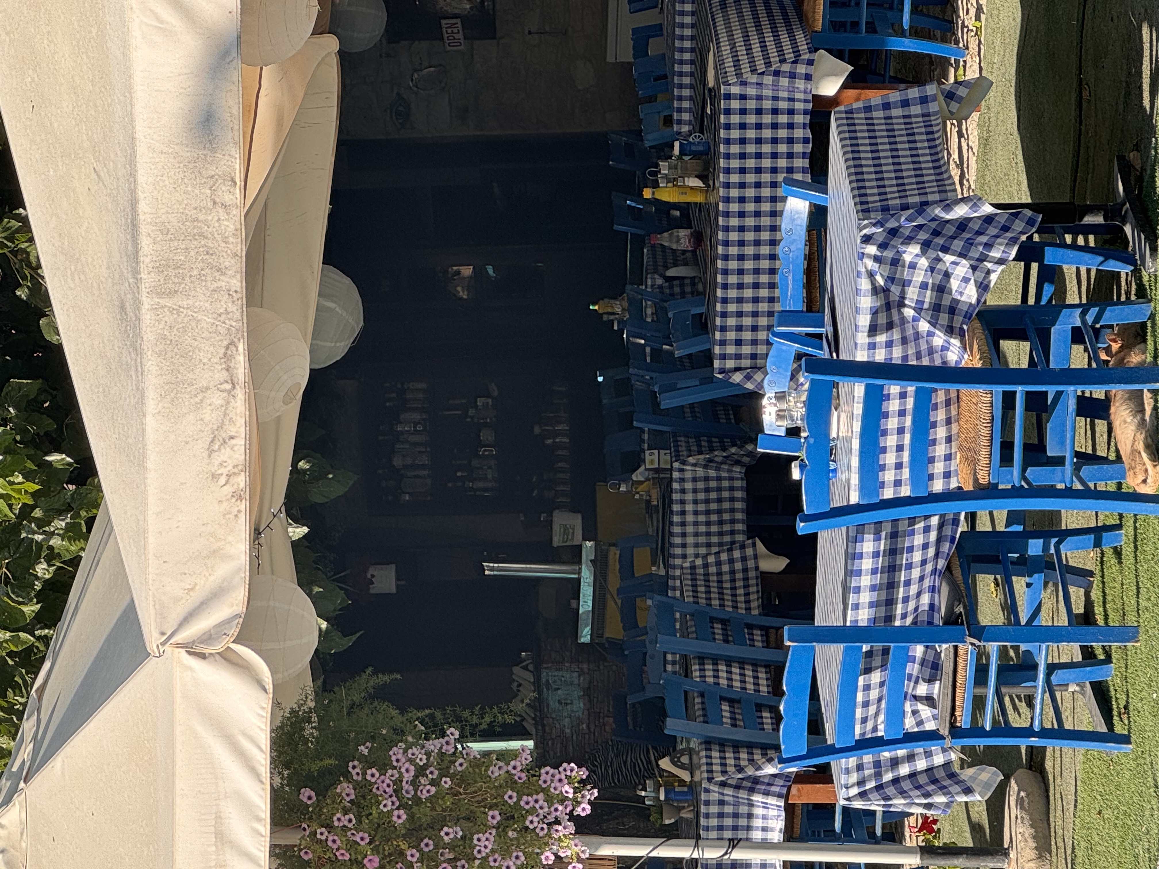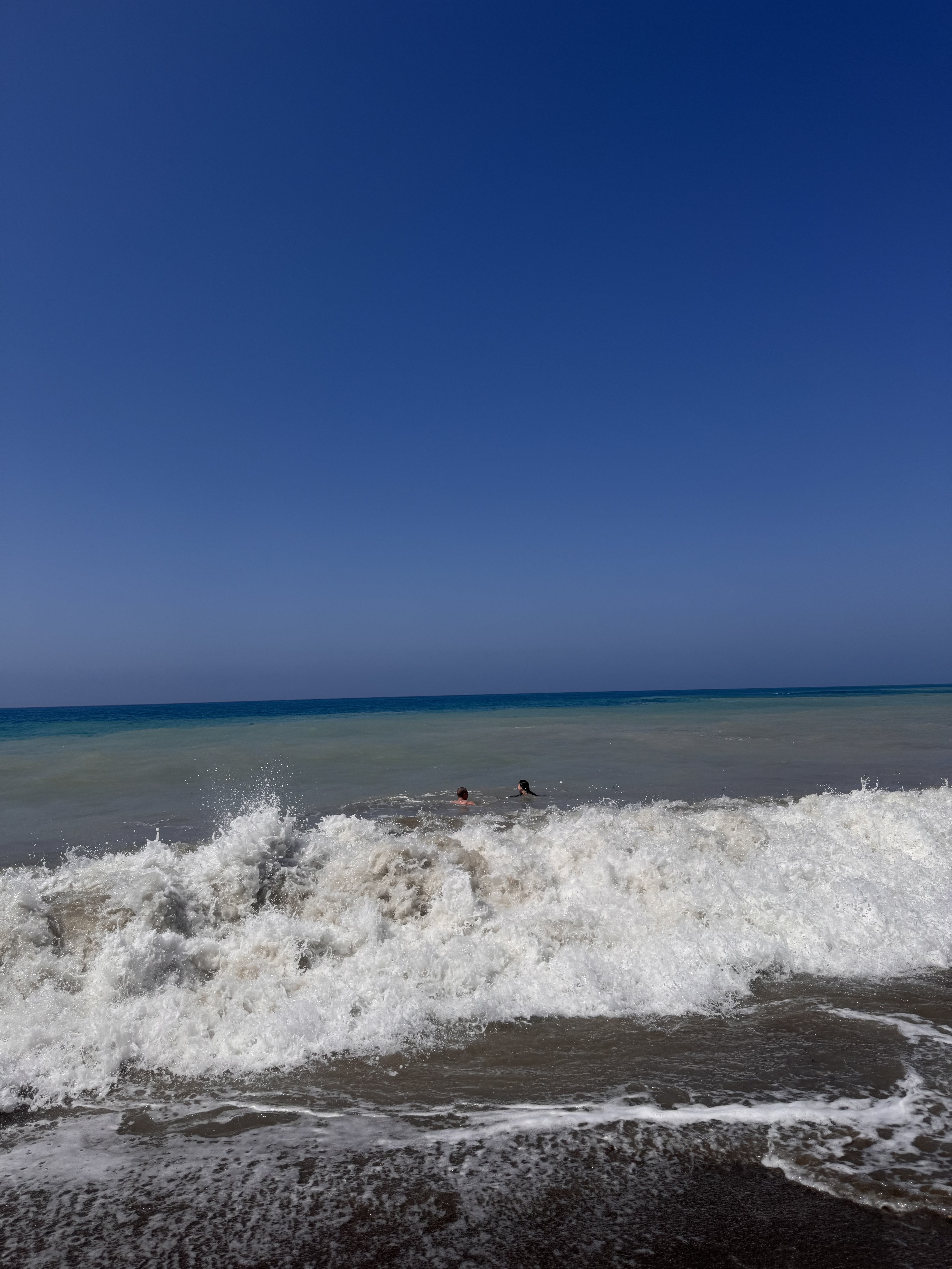 Zajtrk in kava ob plaži sta nas hitro spravila v “grški vibe”: polne plaže, ležalniki, vonj po sončni kremi. Sistem pa zanimiv, do ležalnika ne prideš kar tako! Dobiš številko in čakaš, da te stric pokliče, kot pri zdravniku. Mi smo bili številka 14.