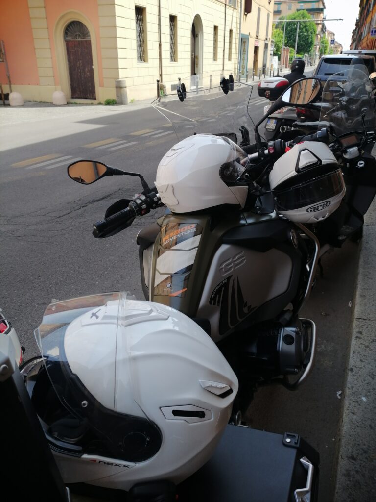 Veseli, da je skoraj več kot pol poti za nami smo parkirali motorje na bele oznake za motorje, kar pomeni v Italiji da je parking brezplačen.