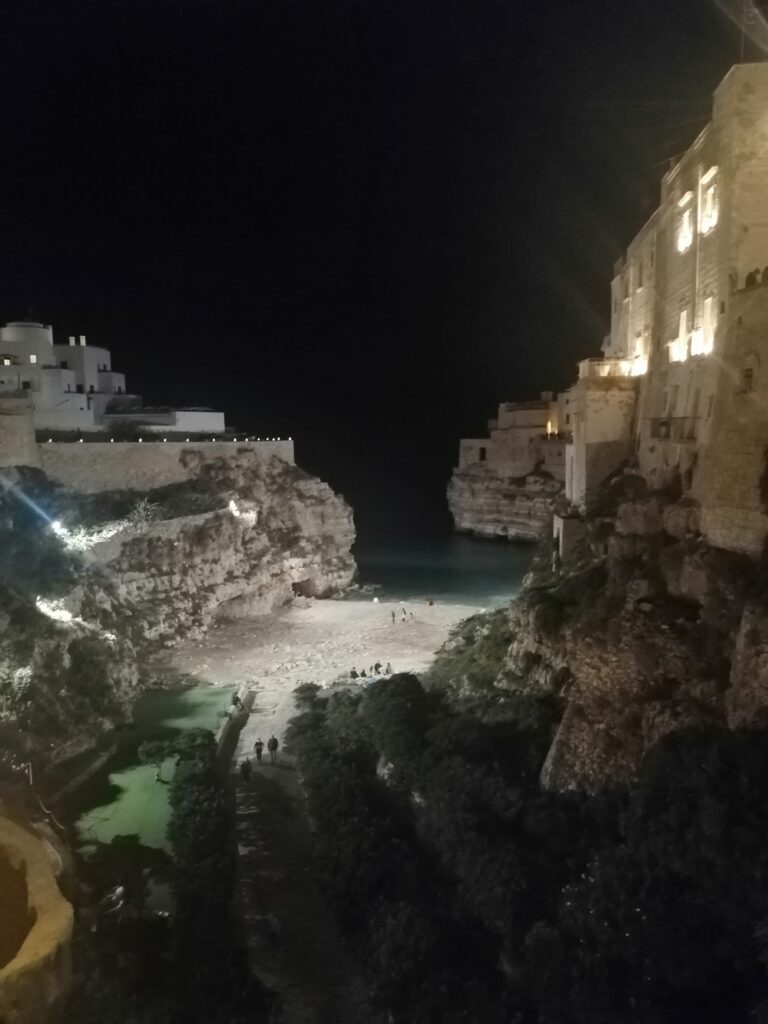 Prvi postanek najinega potovanja je bil osupljiv Polignano a Mare. Z roko v roki sva raziskovala ozke uličice starega mesta in uživala v razgledih na kristalno čisto morje. Začetek potovanja je bil kot pravljica, ki se je odvijala ob zvokih valov, ulične romantične glasbe in dobesedno fuziji okusov, ko sva probala vsak svojo jed v luštni romantični restavraciji ob morju, kjer ti pivo postrežejo v posodi za šampanjec. Ob okušanju hrane sva se oba začela predajati neopisljivo dobrim okusom, hrana je dobesedno pobožala moje brbončice v ustih in še marsikje.
