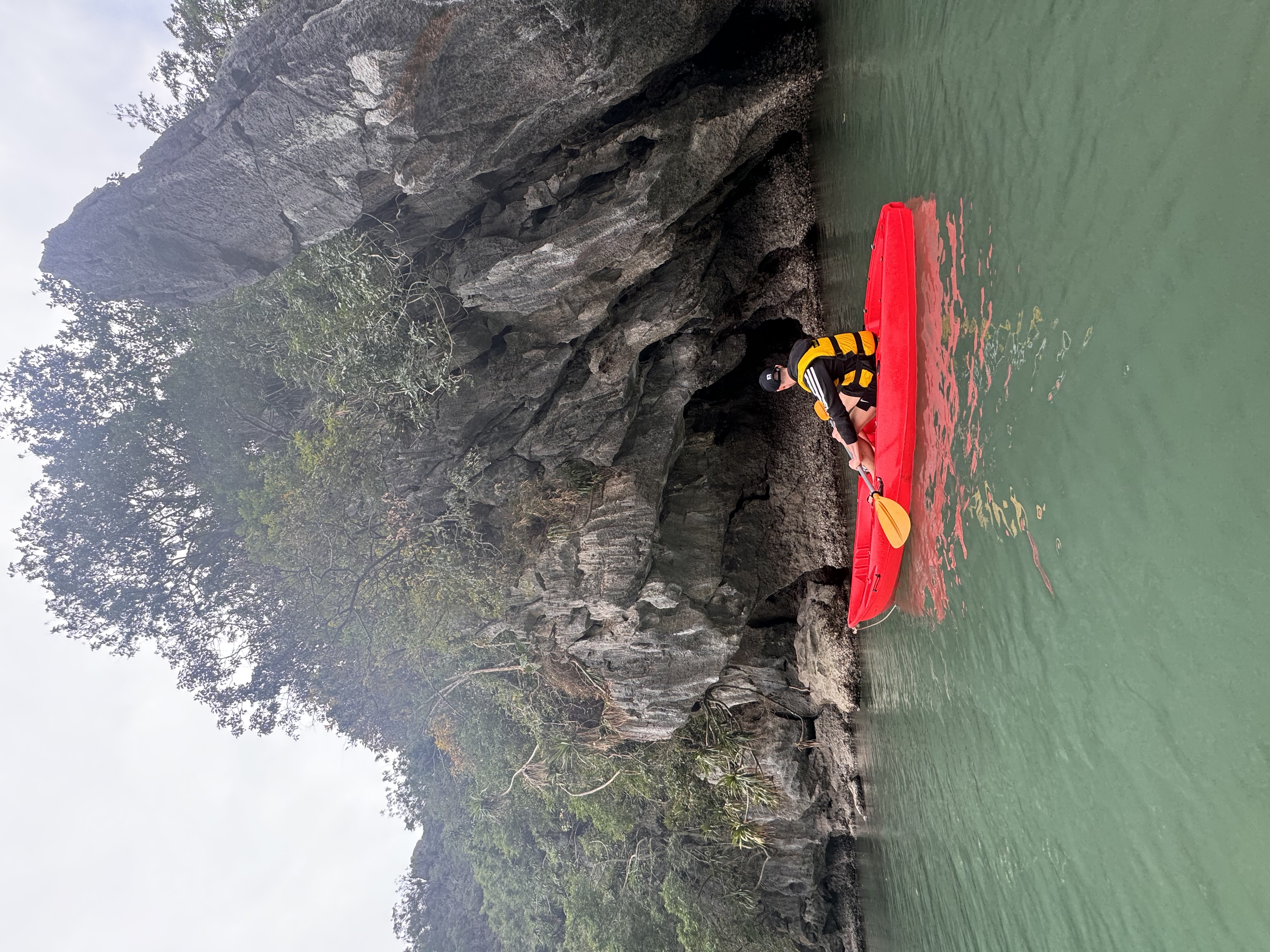 Na vrsti je bil poseben preizkus poguma – vožnja s plastičnimi kanuji. No, Patrik, naš navihanec, je z žarom v očeh takoj želel svoj kanu. Dražen pa je skeptično pogledal naš kanu in mi rekel: »A je to sploh zame? Glej ga, že zdaj je na meji, da ne potone!« Z nekaj vzpodbudnimi besedami smo se spustili na vodo, čeprav je bilo jasno, da se Dražen bolj drži za rob čolna kot vesla. Rahlo mokri, zaradi nestabilnosti kanuja in Patrika, ki je kao nehote poslal val proti Draženu, smo se peljali skozi idilično pokrajino med veličastnimi kanjoni v Ha Long Bay, videli opice in srečne turiste, pojoče Kitajce.